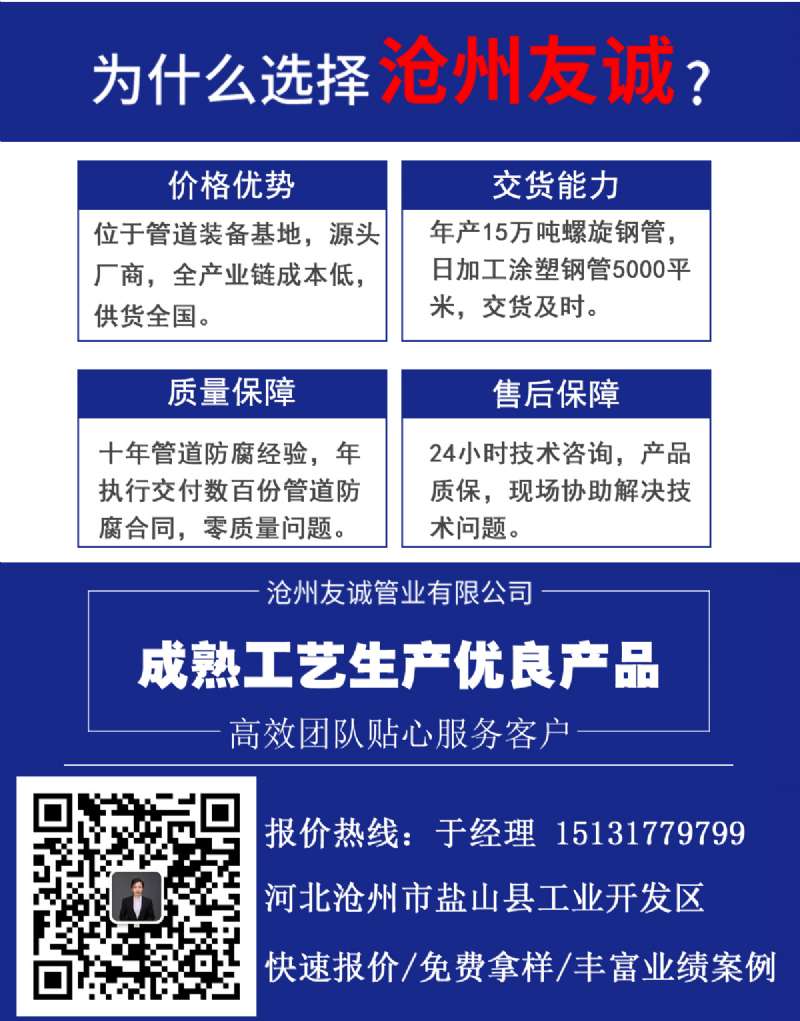 涂塑鋼管的管壁光潔、排水性能好、流體阻力小、不結(jié)垢是相比于其它管道的優(yōu)點(diǎn),可以極大程度的降低損失。同時(shí),大口徑涂塑管的線性膨脹系數(shù)非常小,這就使其作為主干輸水管非常有利,大大克服了其他塑料和普通管材線性膨脹系數(shù)大的缺陷。大口徑涂塑鋼管是傳統(tǒng)鋼塑管、鍍鋅管升級(jí)型的高性價(jià)比產(chǎn)品。其具有綜合特點(diǎn),即有鋼管的高強(qiáng)度、高延伸性、低溫脆性好、膨脹系數(shù)小,又有塑料管耐腐蝕、耐磨損、流體阻力小等優(yōu)點(diǎn),屬于種新型的給排水、防腐綠色大口徑管,被國(guó)內(nèi)各行業(yè)越來(lái)越廣泛的采用。