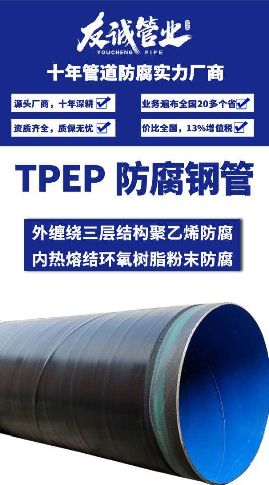 TPEP防腐鋼管全稱(chēng)為:外纏繞聚乙烯內(nèi)熔結(jié)環(huán)氧防腐管道。TPEP防腐管道(T是Triple,表示三倍的,三部分的,這里指三層的,PE,聚乙烯,EP,熱熔結(jié)環(huán)氧樹(shù)脂粉末) 二、母材鋼管材質(zhì): 無(wú)縫、直縫或者螺旋鋼管,三、外壁防腐形式: 采用三層結(jié)構(gòu)聚乙烯防腐涂層,厚度≥2.5mm;執(zhí)行標(biāo)準(zhǔn):《埋地鋼質(zhì)管道聚乙烯防腐層》 四、內(nèi)壁防腐形式: 采用熱熔結(jié)環(huán)氧樹(shù)脂粉末涂層,厚度≥350um,執(zhí)行標(biāo)準(zhǔn):《給水涂塑復(fù)合鋼管》 五、生產(chǎn)工藝介紹: TPEP防腐管道,產(chǎn)品內(nèi)壁采用中頻加熱噴涂環(huán)氧樹(shù)脂粉末的防腐方式,粉末經(jīng)高溫加熱熔結(jié)后均勻地涂覆在管體表面上。產(chǎn)品適用于多種條件下的管道輸送工程,是對(duì)傳統(tǒng)管道產(chǎn)品的一次革命,是替代鋼筒砼管、球墨鑄鐵管、PE管等傳統(tǒng)產(chǎn)品的選擇。TPEP是一種防腐結(jié)構(gòu),是新一代應(yīng)用于長(zhǎng)距離輸水管道的防腐形式,與傳統(tǒng)輸送管道對(duì)比,具有諸多優(yōu)勢(shì)特點(diǎn),管道外防腐為3PE,管道內(nèi)防腐為熔結(jié)環(huán)氧粉末,管道內(nèi)壁的防腐標(biāo)準(zhǔn)達(dá)到了食品級(jí)