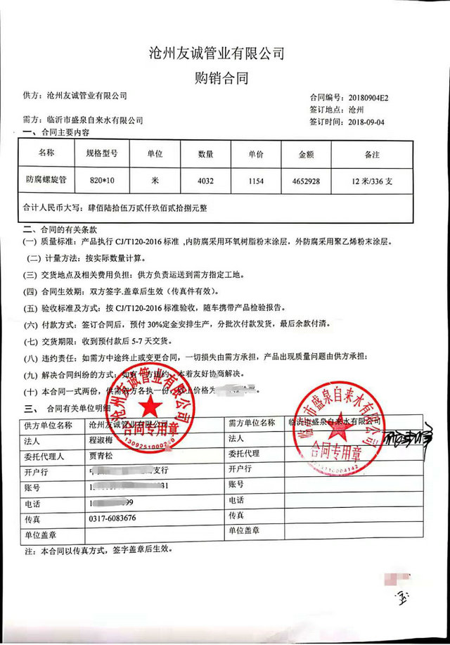 2018年9月我公司與沂州水務(wù)集團(tuán)臨沂市盛泉自來水有限公司簽訂TPEP防腐螺旋鋼管購銷合同,DN800內(nèi)外防腐鋼管4000米,感謝張總的信任,與貴公司的合同讓我們公司在自來水管道領(lǐng)域有了一個新的突破,歡迎各界領(lǐng)域客戶前來合作.