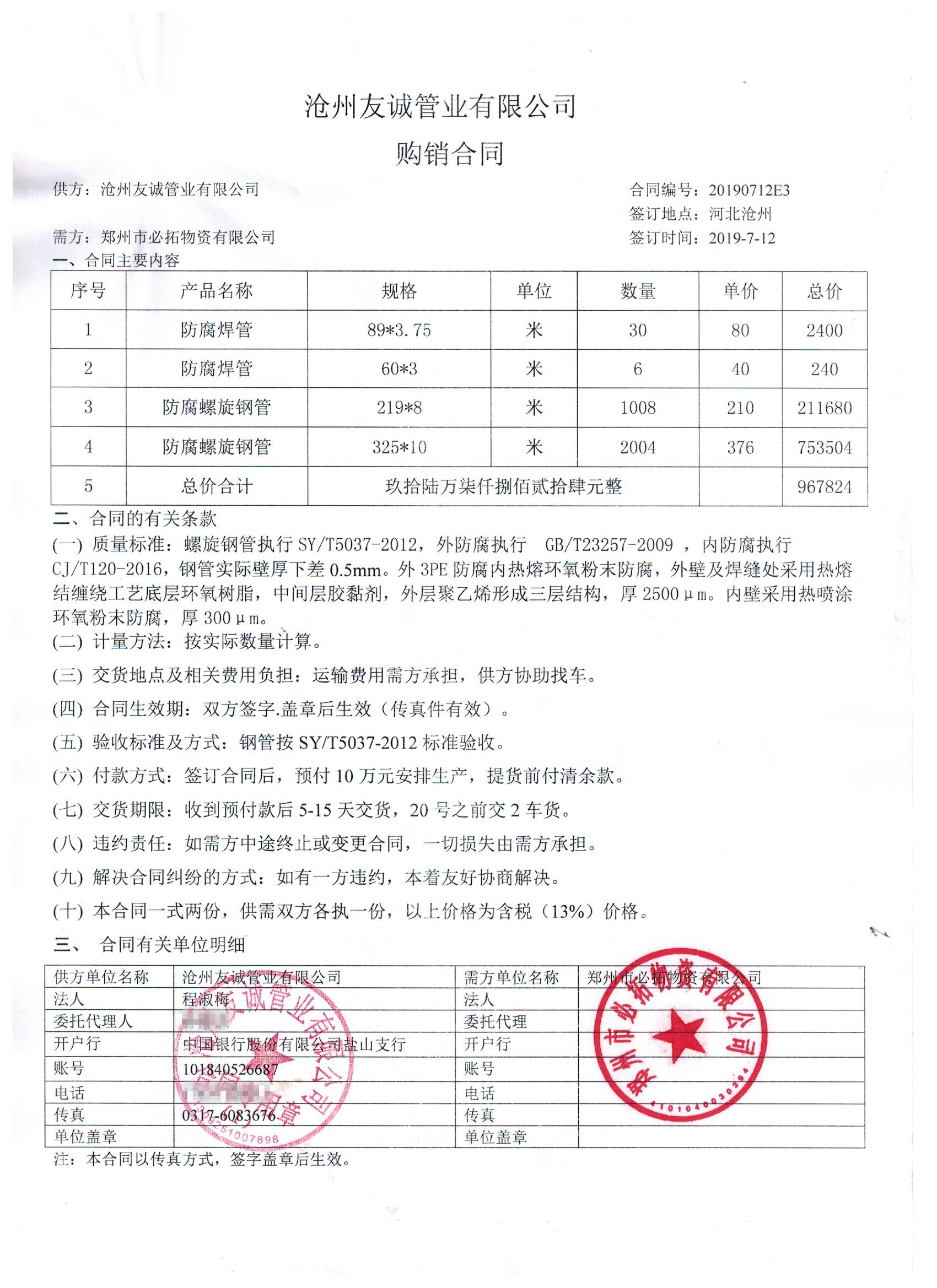 2019年7月份,我公司與鄭州市必拓物資有限公司簽訂了防腐鋼管的合同,感謝貴公司對我廠一如既往的信賴。